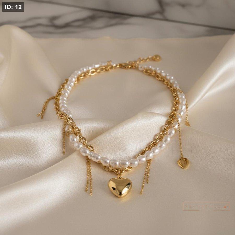 سنسال أنيق يجمع بين اللؤلؤ والسلسلة الذهبية بتصميم متعدد الطبقات مزين بتعليقة قلب ناعمة، مصنوع من خامة معدنية عالية الجودة ليمنحك لمسة أنثوية راقية ومميزة