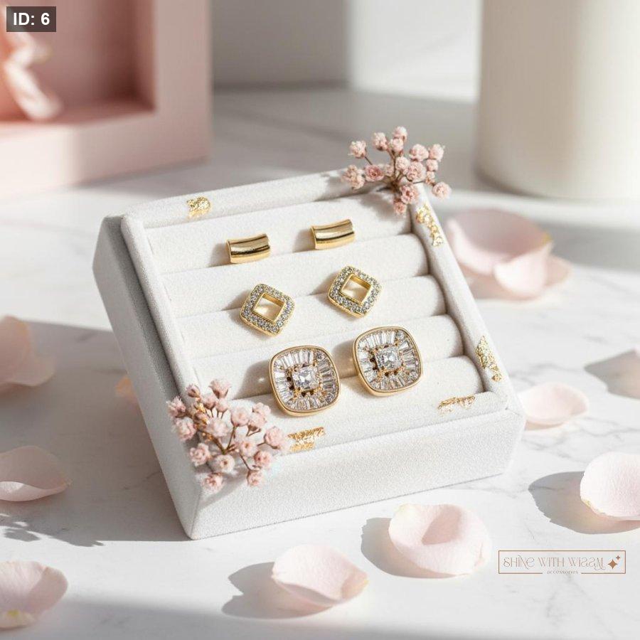 طقم اقراط ذهبي بتصاميم متنوعة من خامة معدنية عالية الجودة، مرصّع بحبيبات لامعة تضيف لمسة فخامة وأناقة تناسب جميع الإطلالات